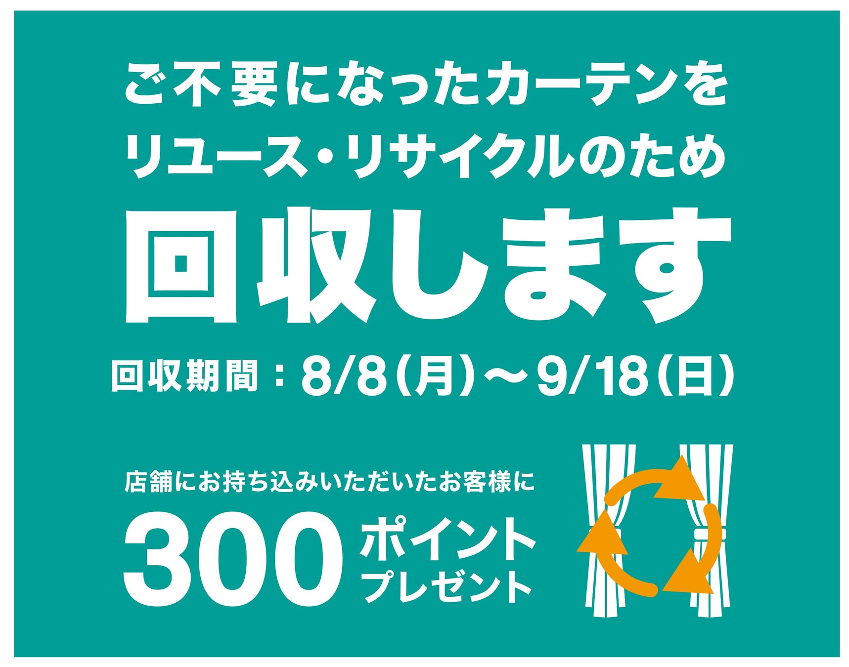 ※カーテンを回収キャンペーン前にご購入いただき、ご注文いただいた商品を後日店頭へ取りにきていただく際に回収ができるよう、対象期間を7月11日(月)~9月18日(日)とさせていただきます。