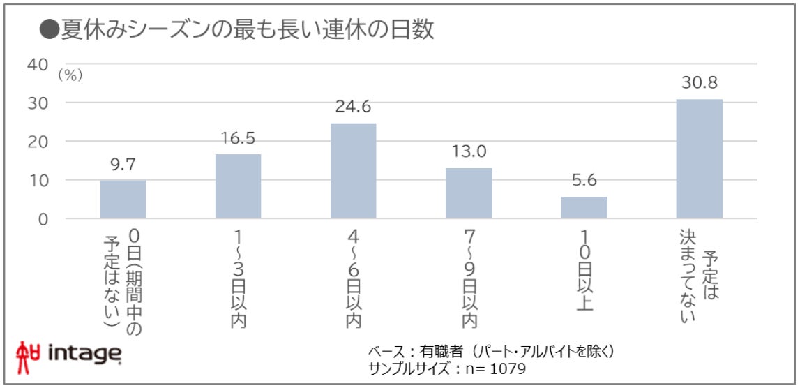 有職者(パート・アルバイトを除く)に2022年の夏休みシーズンにおける「最も長い連休の日数」を質問したところ、「4~6日以内」が25%と最も多く、次いで「1~3日以内(17%)」となっており、1週間未満が4割を占める結果となった。また、7日以上の連休を予定している「しっかりのんびり休む派」も2割弱存在する。