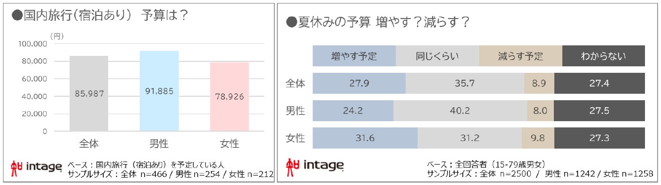 国内旅行(宿泊あり)のおおよその予算感を確認したところ、全体平均では「85,987円」となった。性別でみると、男性は「91,885円」、女性は「78,926円」となり、男性の方が13,000円ほど多くなっていた。