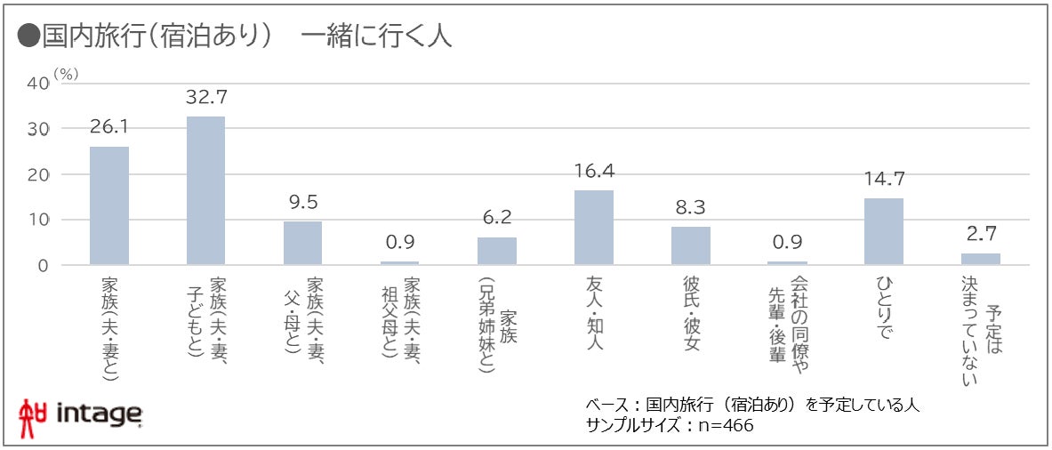 さらに、国内旅行(宿泊あり)に誰と一緒に行くのかを質問したところ、「家族(夫・妻、子供と)(33%)」、「家族(夫・妻と)(26%)」が多く、夫婦あるいは夫婦と子どもとの旅行が過半数を占めた。他に「友人・知人(16%)」、「彼氏・彼女(8%)」との回答もみられ、落ち着きをみせる新型コロナに注意しつつ、家族以外の人との旅行への意欲も回復に向かっていると考えられる。一方で「ひとりで」も15%と多いことから、コロナ下で存在感を増したと言われる「おひとり様市場(ソロ活)」をあらためて認識する結果となった。【図表5】