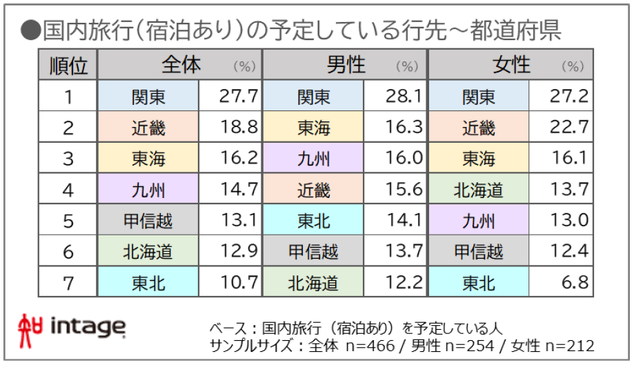 「国内旅行(宿泊あり)」と回答した人に、予定している行先(都道府県)を質問したところ、「関東」が3割弱、次いで、「近畿(19%)」、「東海(16%)」、「九州(15%)」、「甲信越(13%)」と続く結果。男女別でみると、男性は「九州」、「東北」、女性では「近畿」、「北海道」が人気となっている。【図表4】