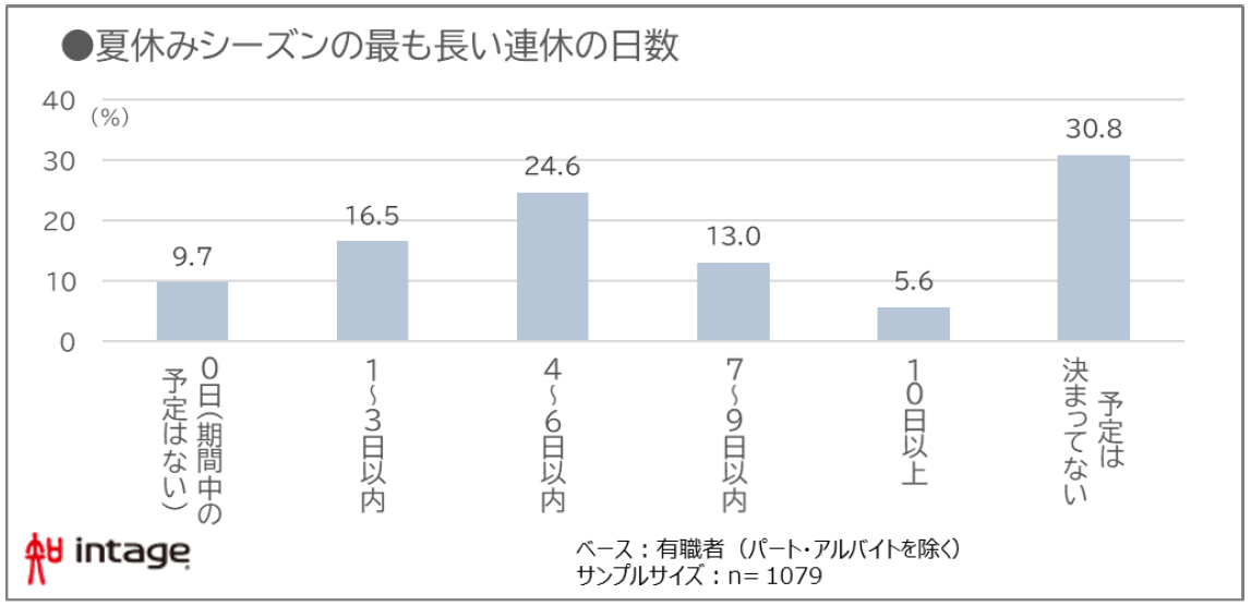 有職者(パート・アルバイトを除く)に2022年の夏休みシーズンにおける「最も長い連休の日数」を質問したところ、「4~6日以内」が25%と最も多く、次いで「1~3日以内(17%)」となっており、1週間未満が4割を占める結果となった。また、7日以上の連休を予定している「しっかりのんびり休む派」も2割弱存在する。
