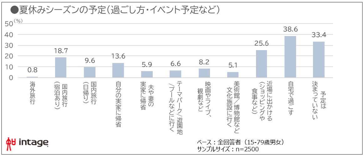 では、今年の夏休みシーズン、「何をして過ごす予定か」を尋ねたところ、行事・イベント系では全体の26%が「近場に出かける」と回答。また国内旅行については19%が「宿泊あり」、10%が「日帰り」での旅行を予定していることがわかった。また、帰省についても「自分の実家」、「夫や妻の実家」にそれぞれ14%、6%の人が帰省を予定。コロナ第5波、緊急事態宣言下だった昨年、旅行や帰省を諦めた人も「今年の夏は」という気持ちでこの夏の計画をしている人がいると考えられる。【図表3】