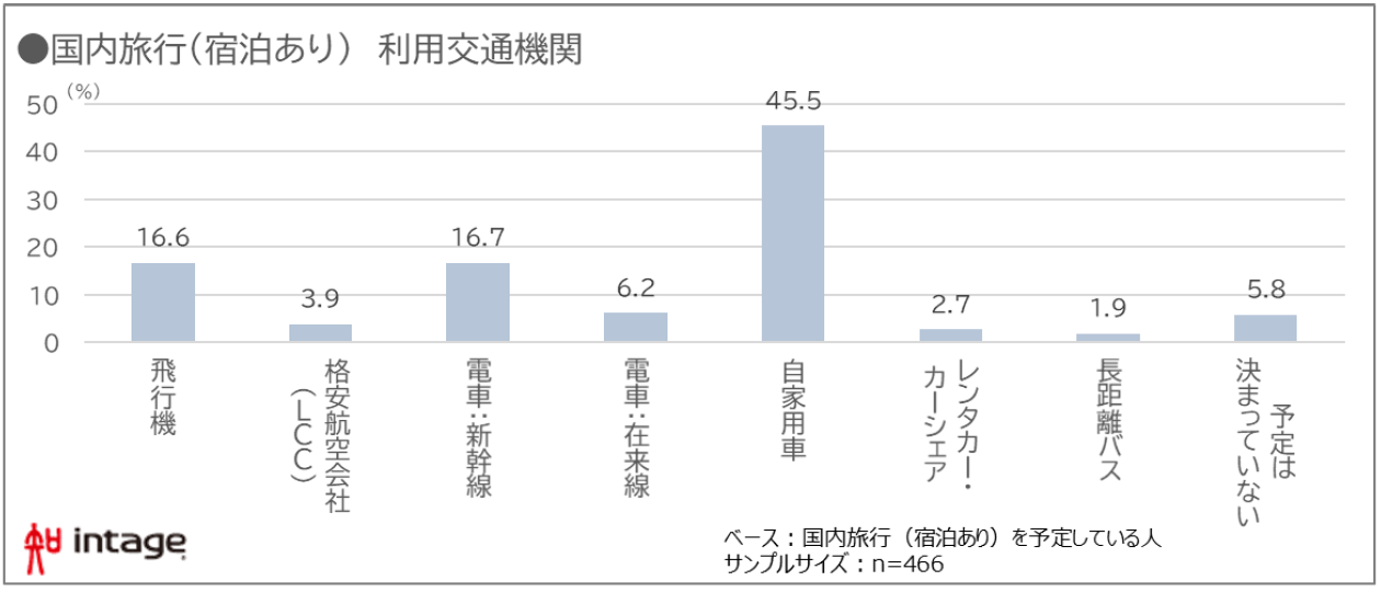 国内旅行(宿泊あり)の移動手段については、「自家用車」が46%と半数近くに上った。また「電車:新幹線(17%)」、「飛行機(17%)」、さらには「格安航空会社(LCC)(4%)」といった移動手段を予定する人も一定おり、遠距離旅行への意欲を反映する結果になった。公共交通機関を選択する人の中には、ガソリン価格の上昇を理由に自家用車での移動を見送り、公共交通機関を選択する人も存在するのではないかと思われる。【図表6】