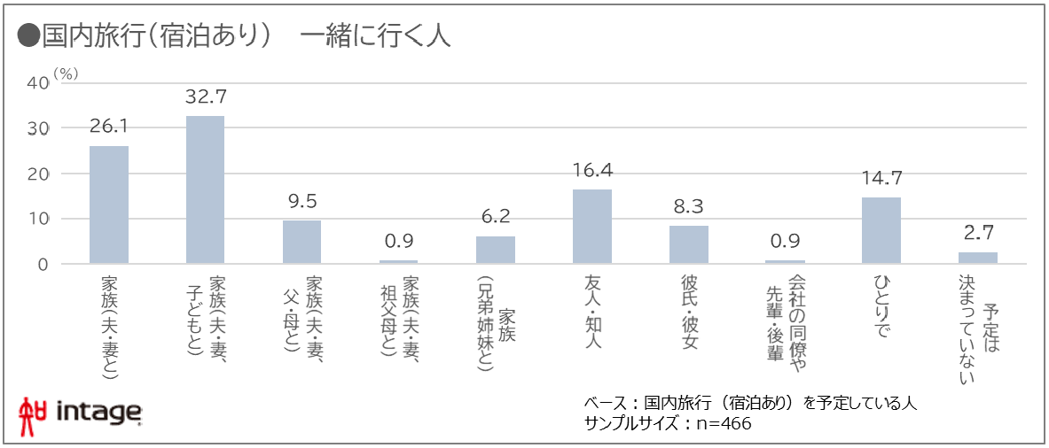 さらに、国内旅行(宿泊あり)に誰と一緒に行くのかを質問したところ、「家族(夫・妻、子供と)(33%)」、「家族(夫・妻と)(26%)」が多く、夫婦あるいは夫婦と子どもとの旅行が過半数を占めた。他に「友人・知人(16%)」、「彼氏・彼女(8%)」との回答もみられ、落ち着きをみせる新型コロナに注意しつつ、家族以外の人との旅行への意欲も回復に向かっていると考えられる。一方で「ひとりで」も15%と多いことから、コロナ下で存在感を増したと言われる「おひとり様市場(ソロ活)」をあらためて認識する結果となった。【図表5】