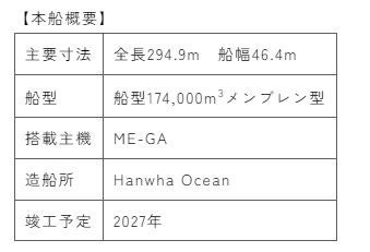 本船はHanwha Ocean Co., Ltd.(本社:韓国)のコジェ造船所にて建造され、2027年に竣工、INEOS向けのLNG輸送に従事する予定です。燃料消費効率を改善した最新型のMAN Energy Solutions社製エンジン(ME-GA)、海水による船体抵抗を低減する空気潤滑システム(Air Lubrication System、註1)、運航効率を高める軸発電機(Shaft Generator、註2)を搭載し、従来のLNG船と比べGHG排出量が削減できる環境に配慮した仕様を採用しています。