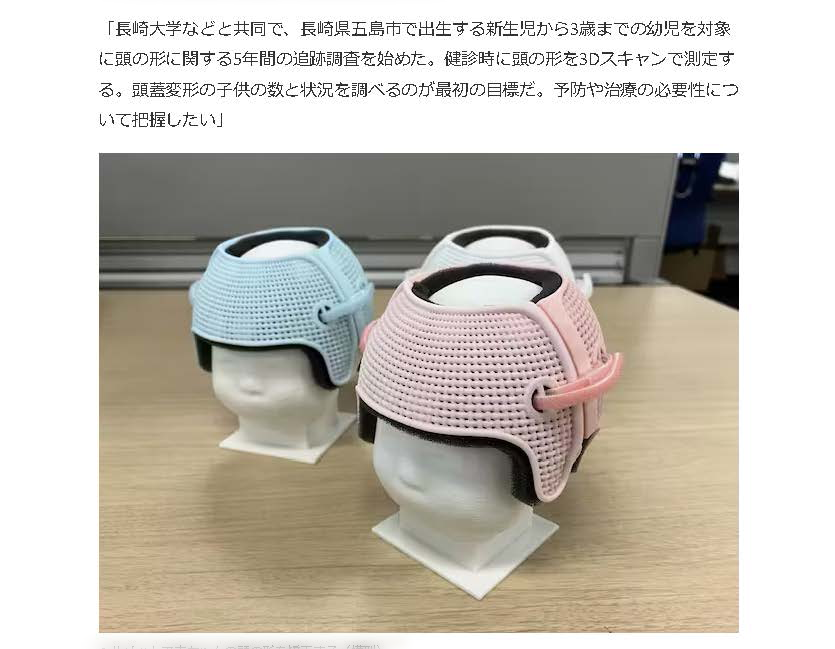 「長崎大学などと共同で、長崎県五島市で出生する新生児から3歳までの幼児を対象に頭の形に関する5年間の追跡調査を始めた。健診時に頭の形を3Dスキャンで測定する。頭蓋変形の子供の数と状況を調べるのが最初の目標だ。予防や治療の必要性について把握したい」