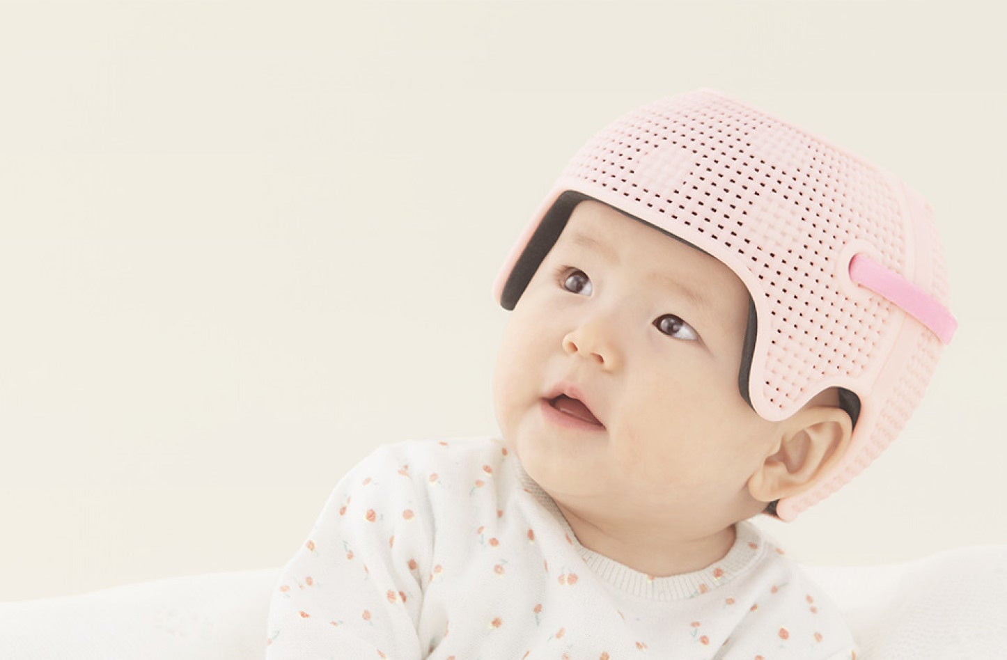 乳児の頭蓋変形矯正のためのヘルメットです。3Dプリンターによって、一人ひとりのお子さまに合わせた完全オーダーメイド。日本の気候、日本人の骨格を考えぬいた独自設計です。