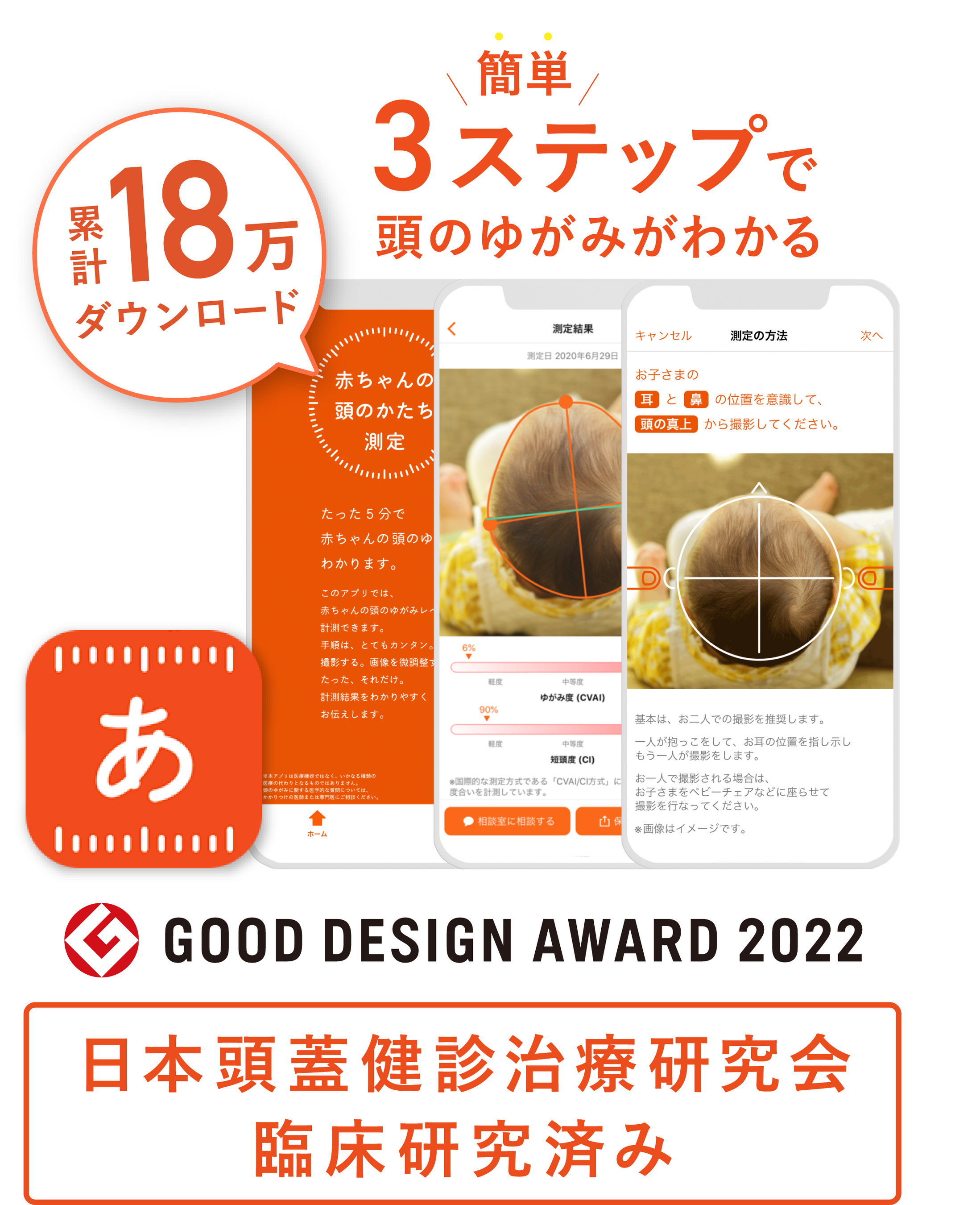 赤ちゃんの頭のかたちの測定は、専用の3Dスキャナーだけでなく、「赤ちゃんの頭のかたち測定アプリ」でも行います。無料で使用できる「赤ちゃんの頭のかたち測定アプリ」では、写真を撮るだけで赤ちゃんの頭のかたちを簡単に計測することができます。累計18万ダウンロード(※2)を超えアプリの精度も向上しており、医師の論文発表等にもアプリデータが使用されています。アプリは医師監修の基に作られており、病院の診察の際にも役立てることもできますので、ぜひダウンロードしお役立てください。