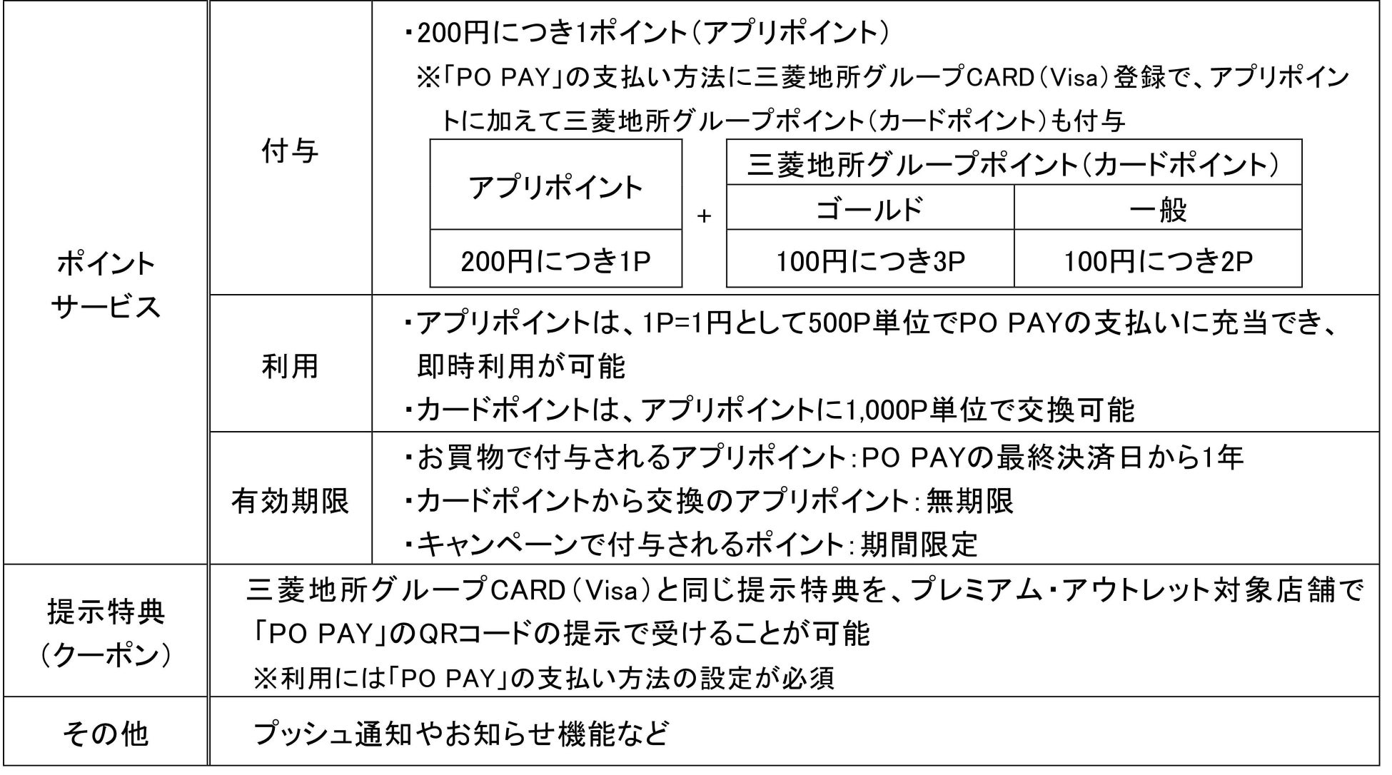 ・「PO PAY」への三菱地所グループCARD(Visa)の登録で、アプリポイント(200円につき1P)に加え、同カードの三菱地所グループポイント(100円につき2P(ゴールドは同3P))を付与。