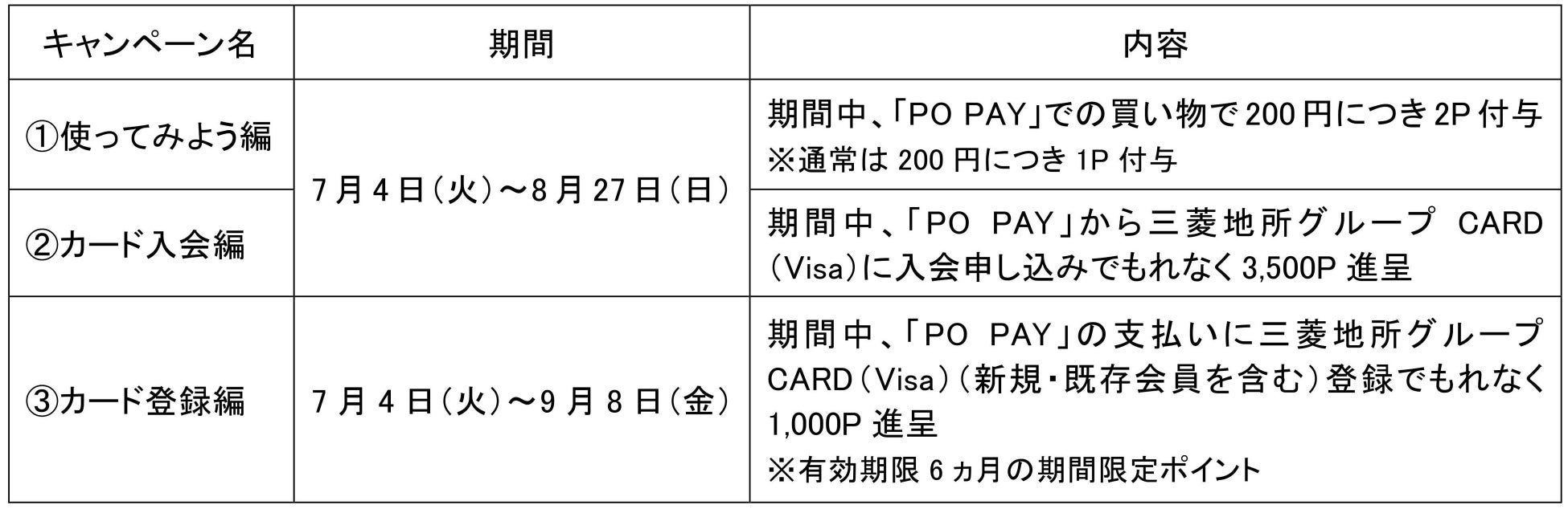なお、本サービス開始を記念し、3つのキャンペーンを実施します。具体的には、7月4日(火)から8月27日(日)までの期間、①「PO PAY」の利用でアプリポイントを2倍付与、②「PO PAY」アプリ内から三菱地所グループCARD(Visa)への入会で同3,500Pを、また、③7月4日(火)から9月8日(金)までに「PO PAY」への三菱地所グループCARD(Visa)の登録で同1,000Pをそれぞれもれなく進呈します。