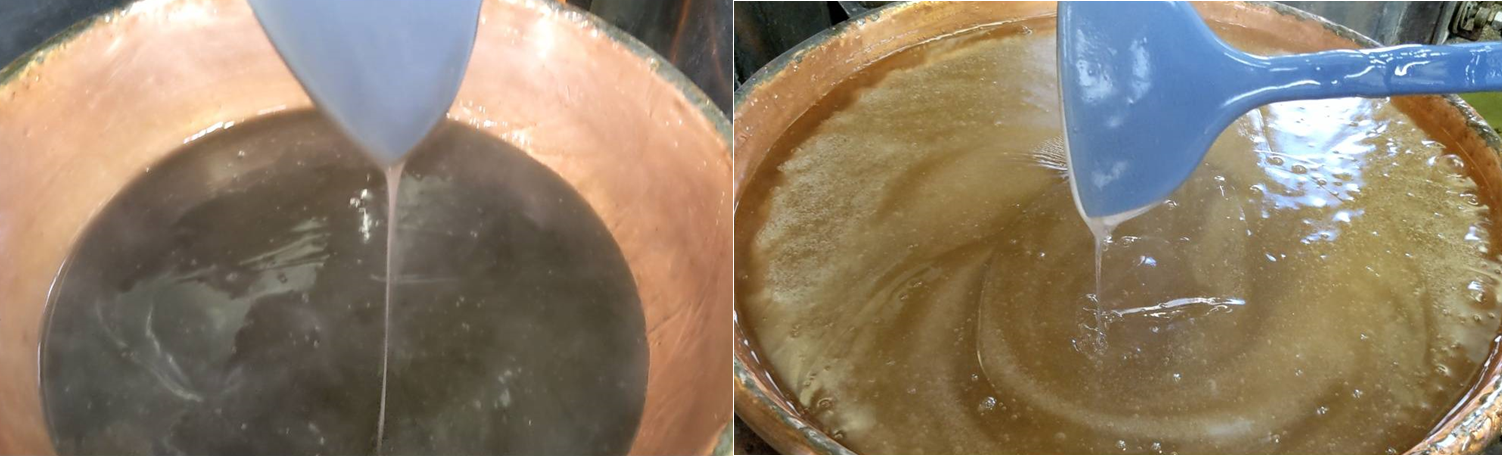 「純本生わらび餅」は山菜のわらびの根をたたき、何度も水にさらし、手間暇をかけて採取された上質な鹿児島県産の本わらび粉100%を使用しています。色味は深い黒緑色で、わらび粉本来の色と風味をそのままに、滑らかなねばりと香りをお楽しみいただけます。わらび粉は原料全体の5%程度しか採取できず、同じく稀少価値があり高価で知られる本葛の約2倍の価格です。