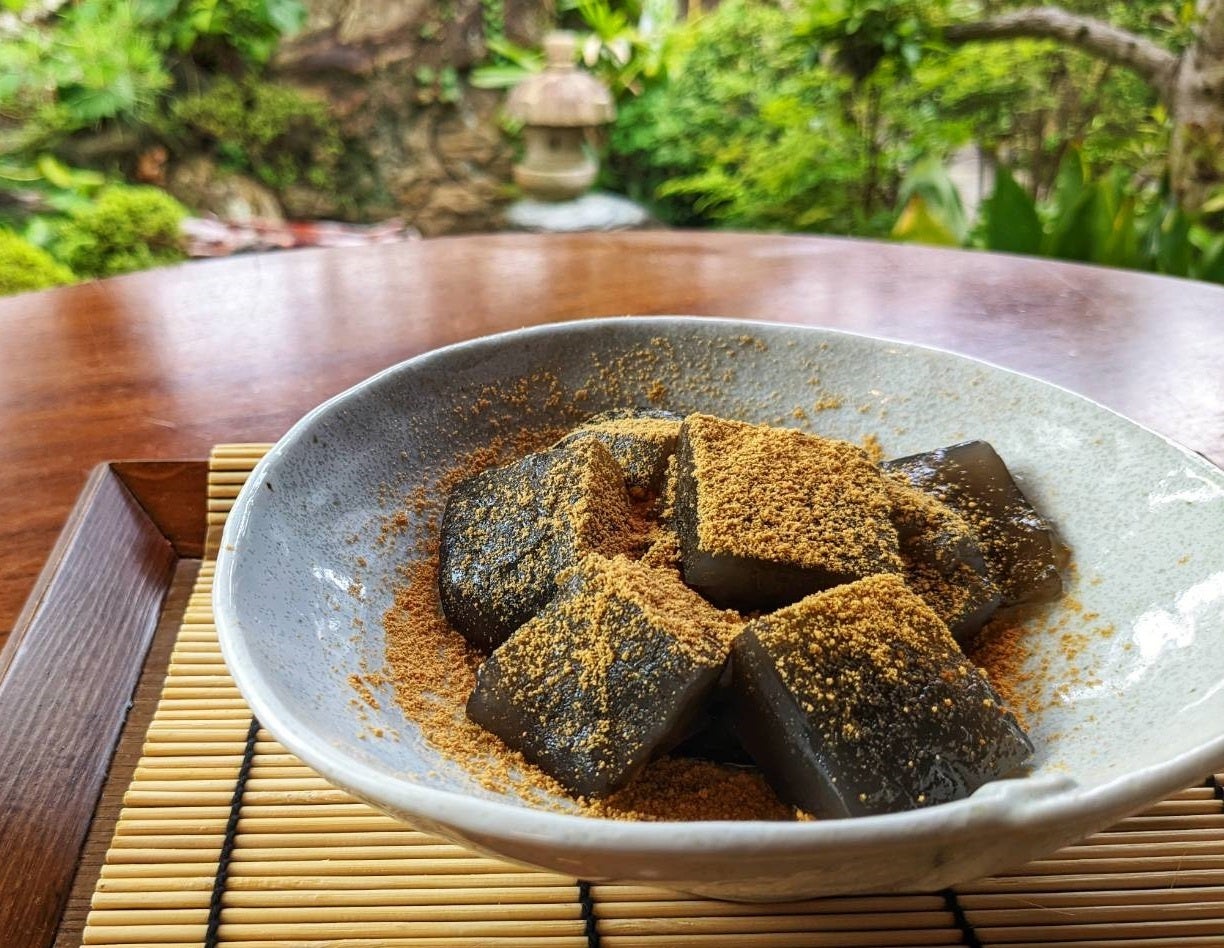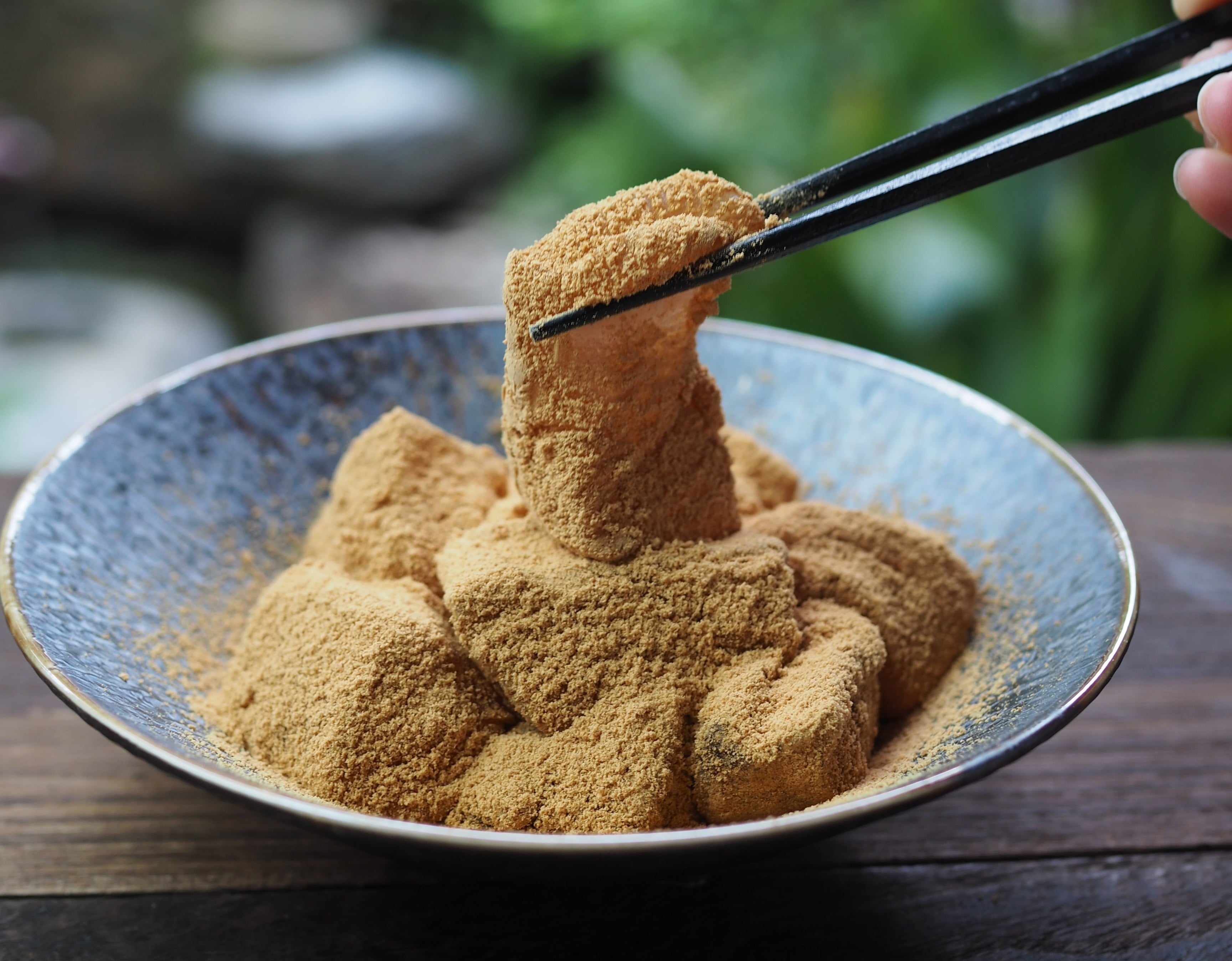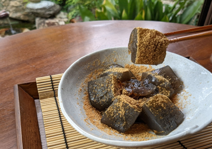 わらび餅と言えば綺麗な白の半透明・・・。実は本わらび粉で作ると黒々となります。
