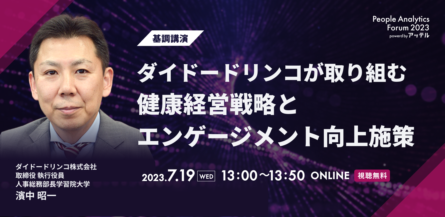 そこで今回はダイドードリンコ社人事総務部長の濱中氏をお迎えし、同社が掲げる「健康経営戦略」の全貌や、「エンゲージメント」を重要視する理由、「向上施策」に関するお取り組みについて解説していただきます。