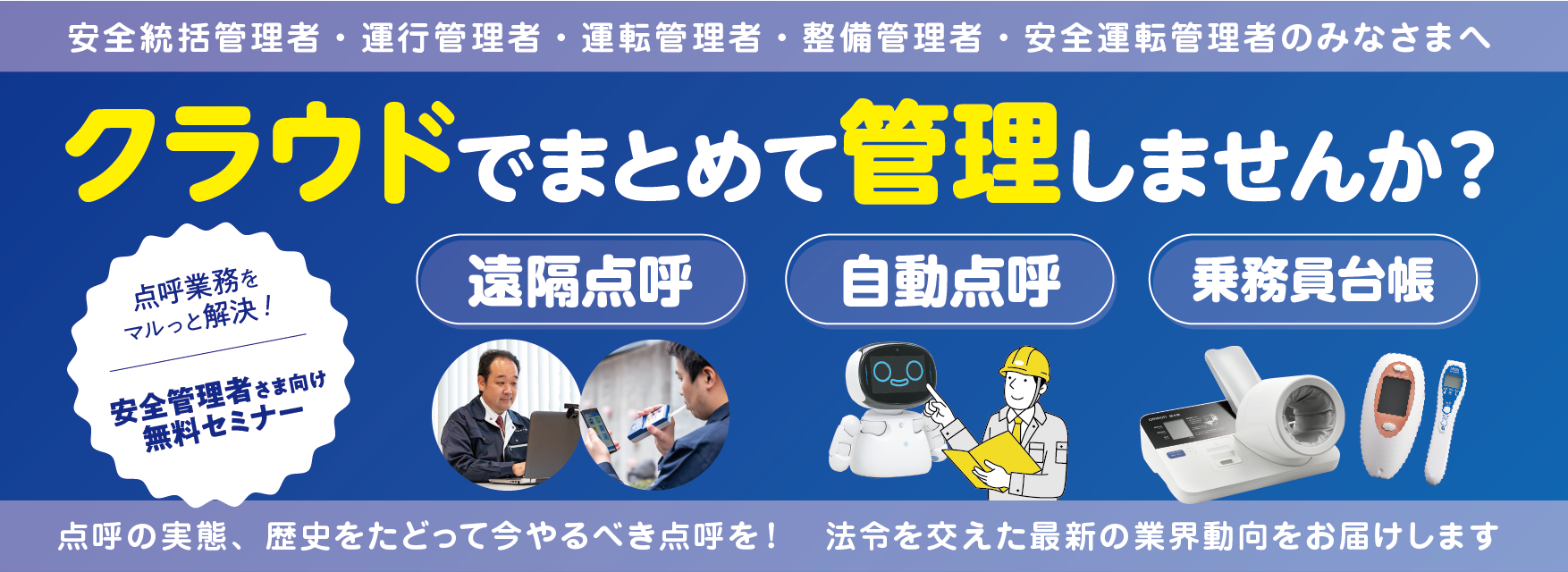 ■詳細はこちらから:点呼業務をマルっと解決!安全管理者さま向け無料セミナー「クラウドでまとめて管理しませんか?」