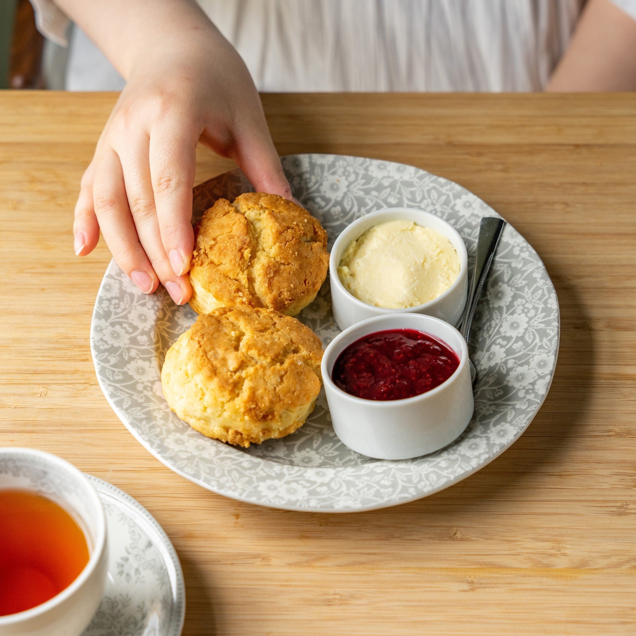 クリームティーとは、紅茶とスコーンのセットを意味するイギリスの喫茶習慣。スコーンはそのままではなく半分に割り、ジャムと濃厚なクロテッドクリームをたっぷりと塗るのが本国でも主流です。KIKI で提供する食材は、すべて自家製です。サクッとした食感がクセになるカントリー風スコーン。岡山県産ジャージークリームを使用したクロテッドクリーム。 無添加で優しい甘みのジャムが、英国文化を忠実に再現しています。