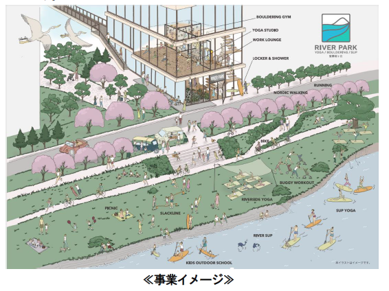 本事業は、聖蹟桜ヶ丘駅から徒歩5分の立地に開業予定の商業施設「サクテラスモール」で、多摩川を 活用したリバーSUP、屋内施設でヨガスタジオ・ボルダリングなど複合的な会員制アウトドアフィットネス事業を展開するものです。