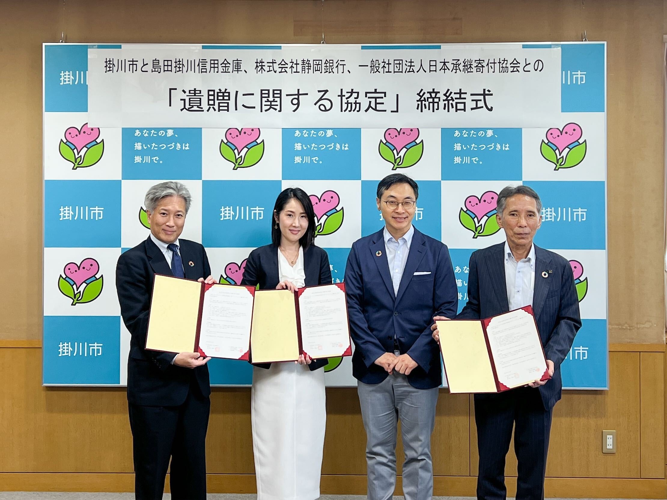 また、掛川市では、市内金融機関とも個別に協定を締結し、 当協会と3者連携をすることでどなたでも気軽に相談できる窓口を設置し、市民のニーズに合わせて当協会と金融機関それぞれの役割の元で遺贈寄付への理解を広めていきたいと考えております。