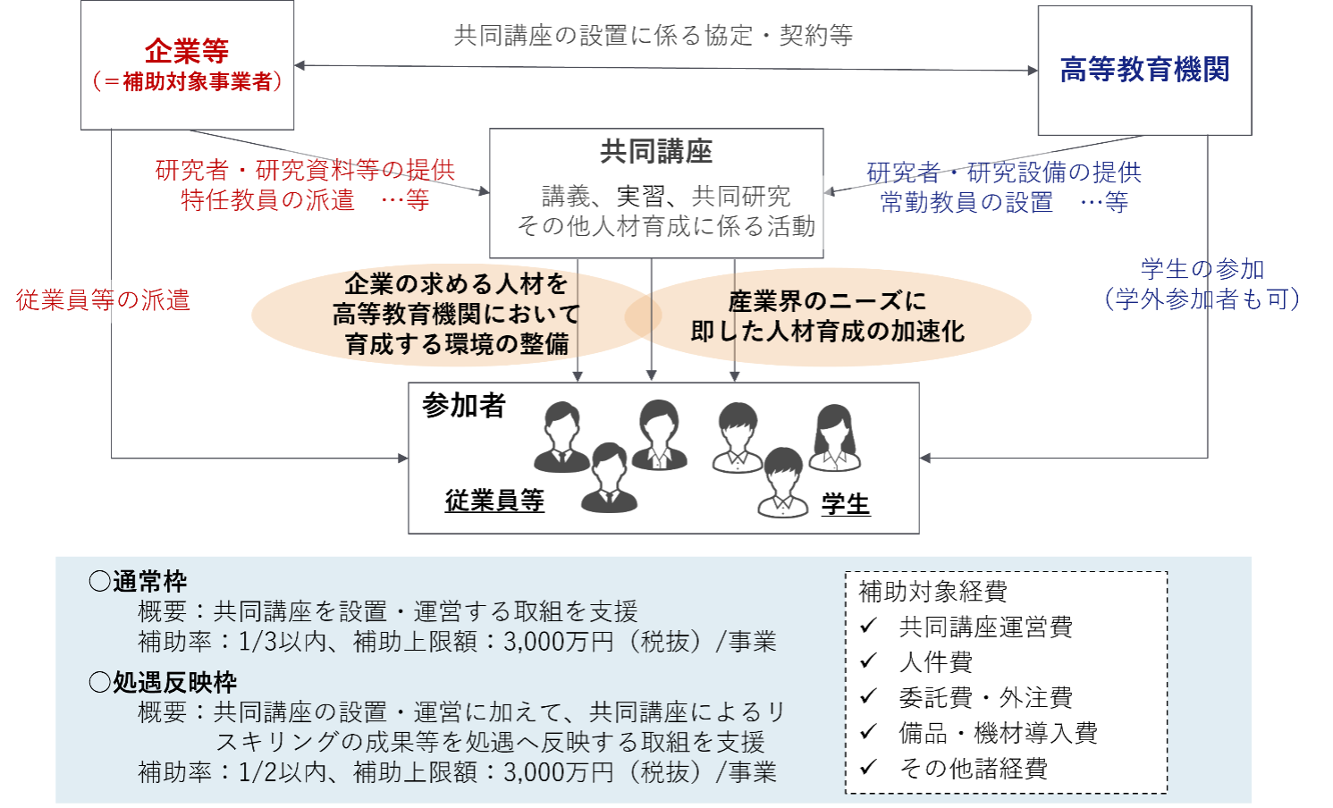そのため、本事業では、企業等が、⼤学・⾼等専⾨学校等の⾼等教育機関において、特定の分野に係る高度人材を育成するために講座やコース・学科等(=共同講座)を設置・運営することを目的として費用を支出する際、当該費用の一部を補助します。こうした取組を通じ、企業内の人材のリスキリングや、当該分野の学生の輩出を実現し、産業界のニーズに即した人材の育成の加速化を図ります。