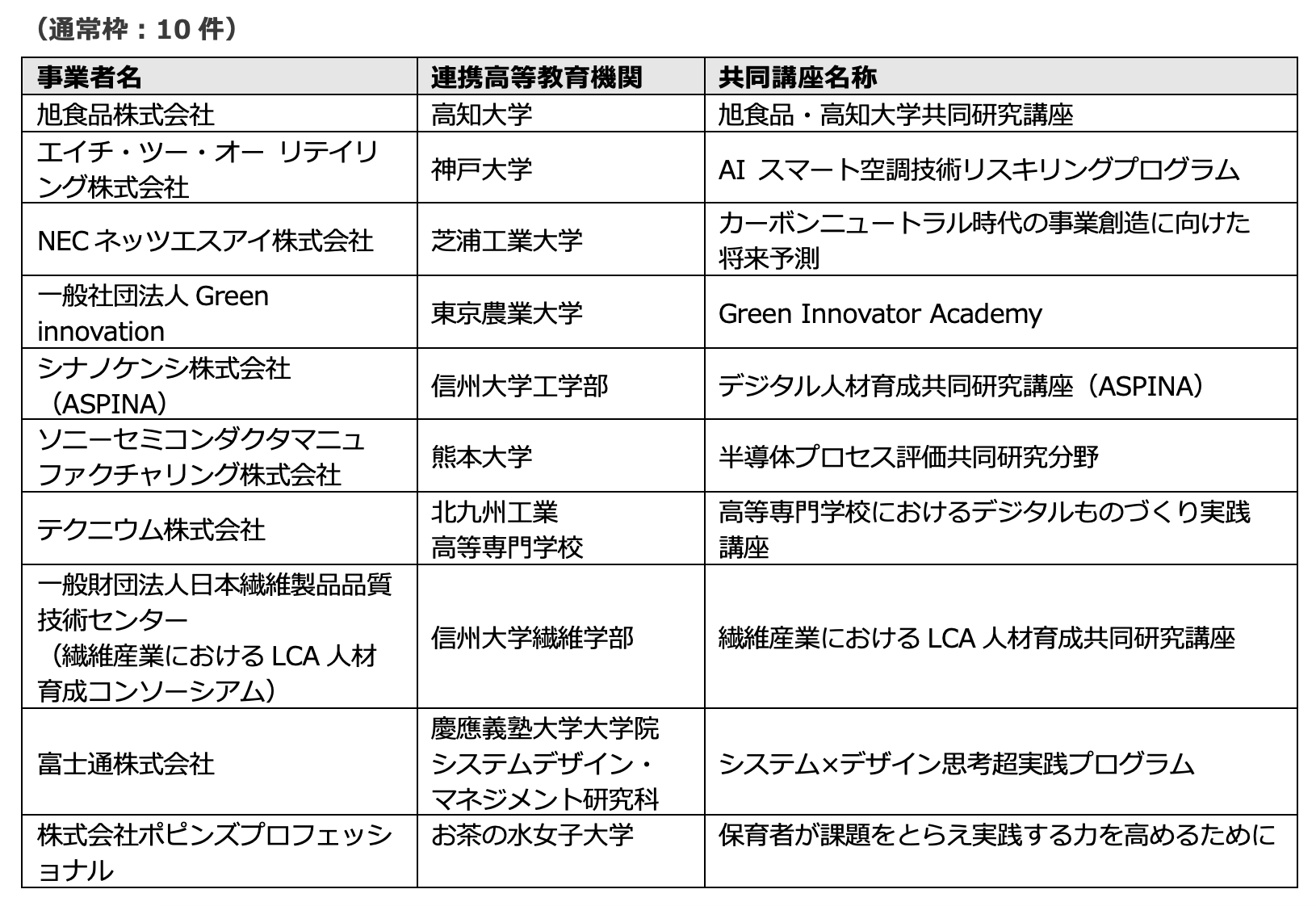 一次公募においては、多彩な22件の共同講座が採択されました。企業内の人材のリスキリングを目的とした取組や、特定業界の学生輩出を目的とした取組、コンソーシアムを組成して業界内で共通する人材課題を解決しようとする取組など、それぞれ設置の目的、領域、育成対象等が異なります。