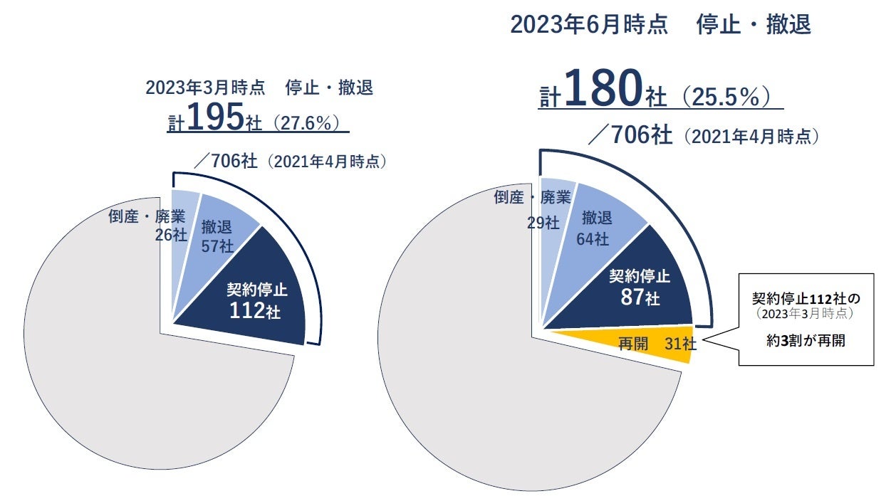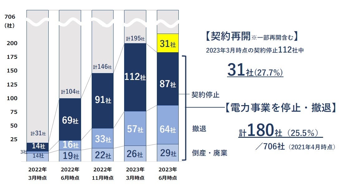 2021年4月時点で登録のあった「新電力会社」(登録小売電気事業者)706社のうち、2023年6月25日時点で「電力事業の契約停止(新規申し込み停止を含む)や撤退、倒産や廃業」が判明したのは180社(構成比25.5%)となり、3月時点の195社から15社(7.7%)減少した。3月時点で「契約停止」となっていた112社のうち31社(同27.7%)がサービスを再開(一部再開を含む)したことで、「契約停止」企業が減少した。