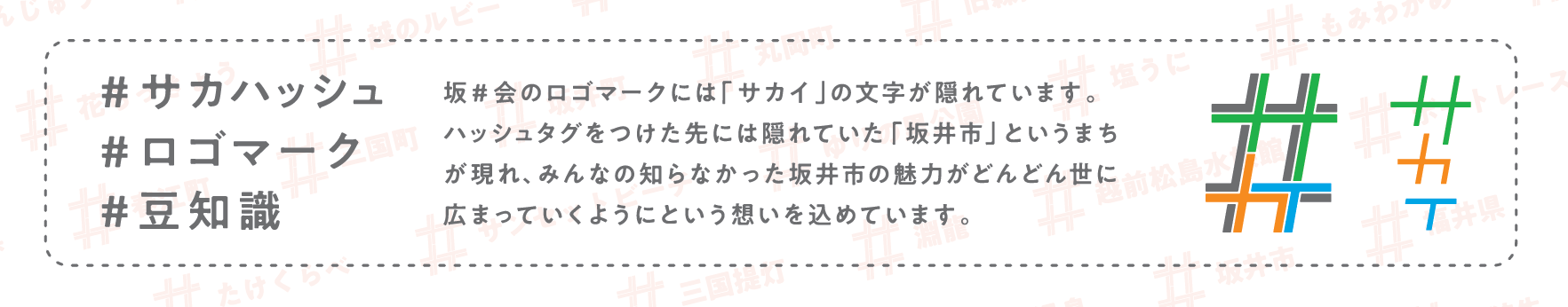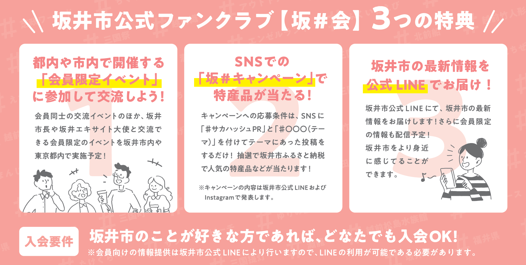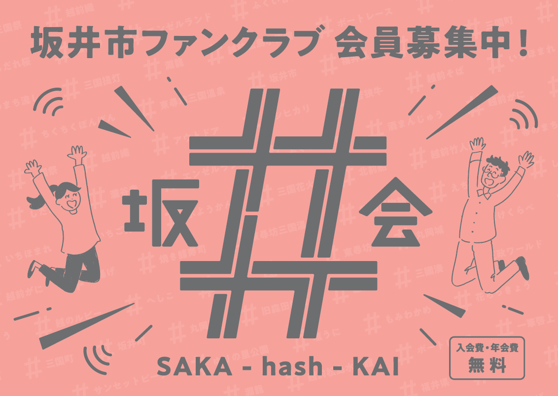 「坂井会(サカイカイ)」ならぬ「坂#会(サカハッシュカイ)」は、坂井市在住者、出身者、ふるさと納税による寄附者など、坂井市のことが好きな方々を集めた坂井市公式ファンクラブです。