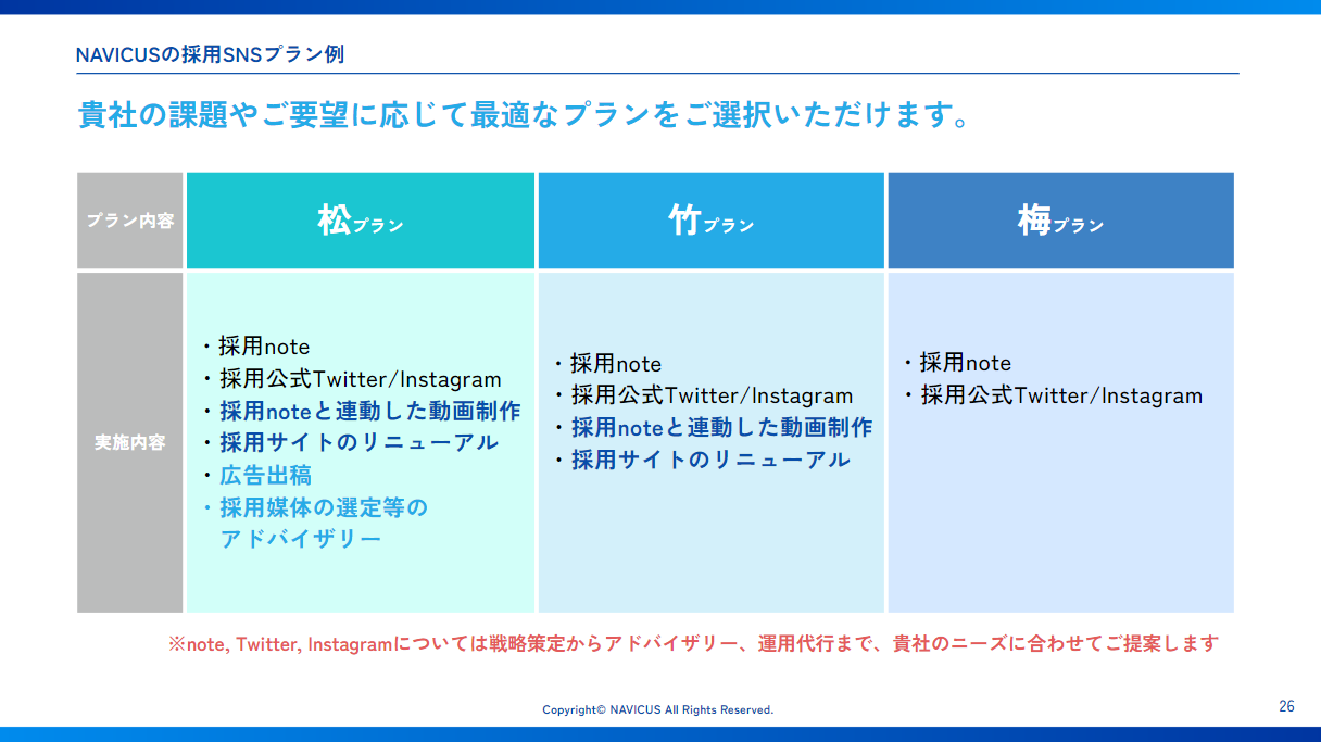 NAVICUSの提供する「採用SNS」サービスでは、自分たちの言葉で語ることに適しているnoteや情報拡散に適した他SNSをはじめ、採用サイトや動画まで幅広くご支援させていただきます。