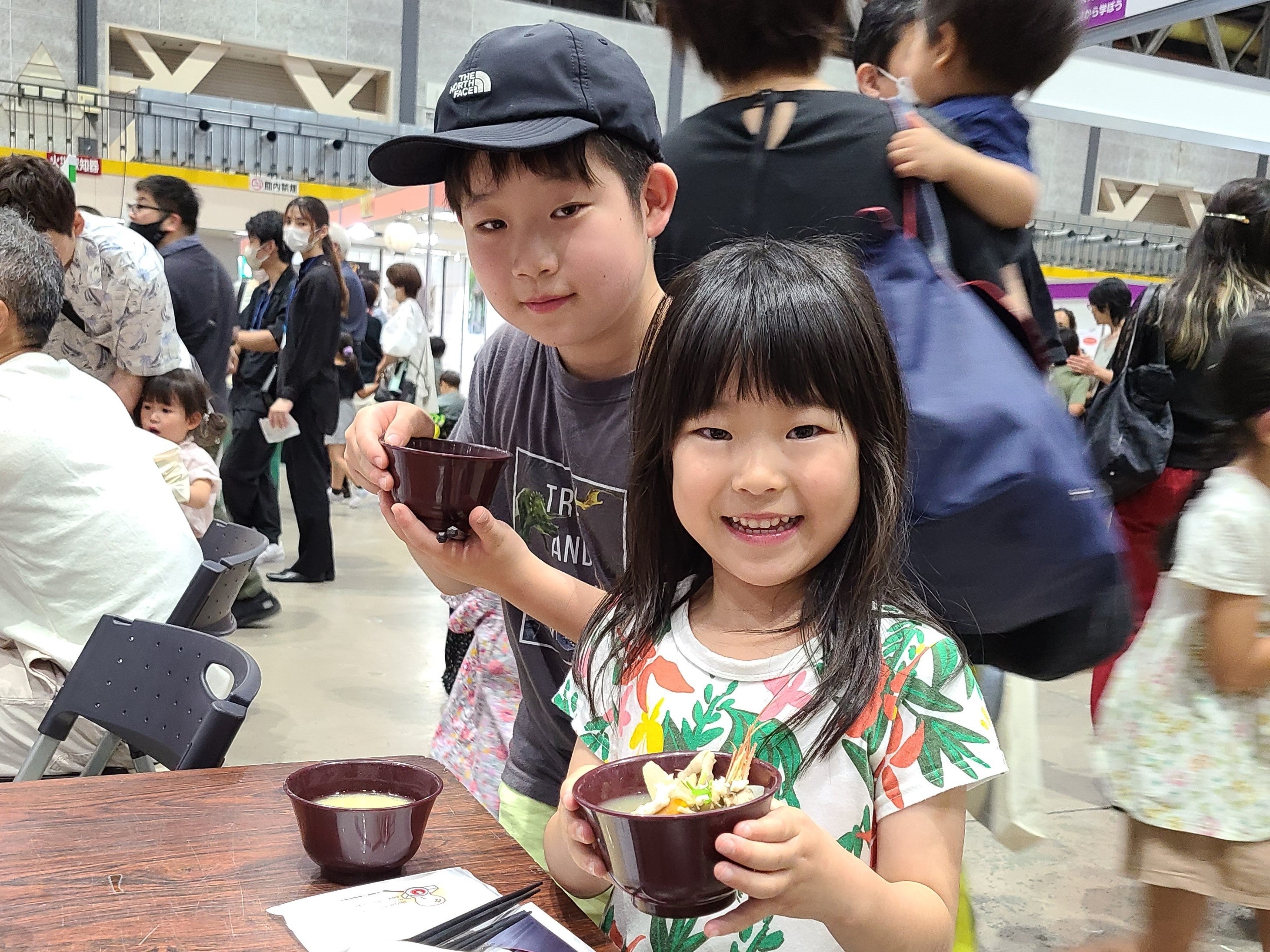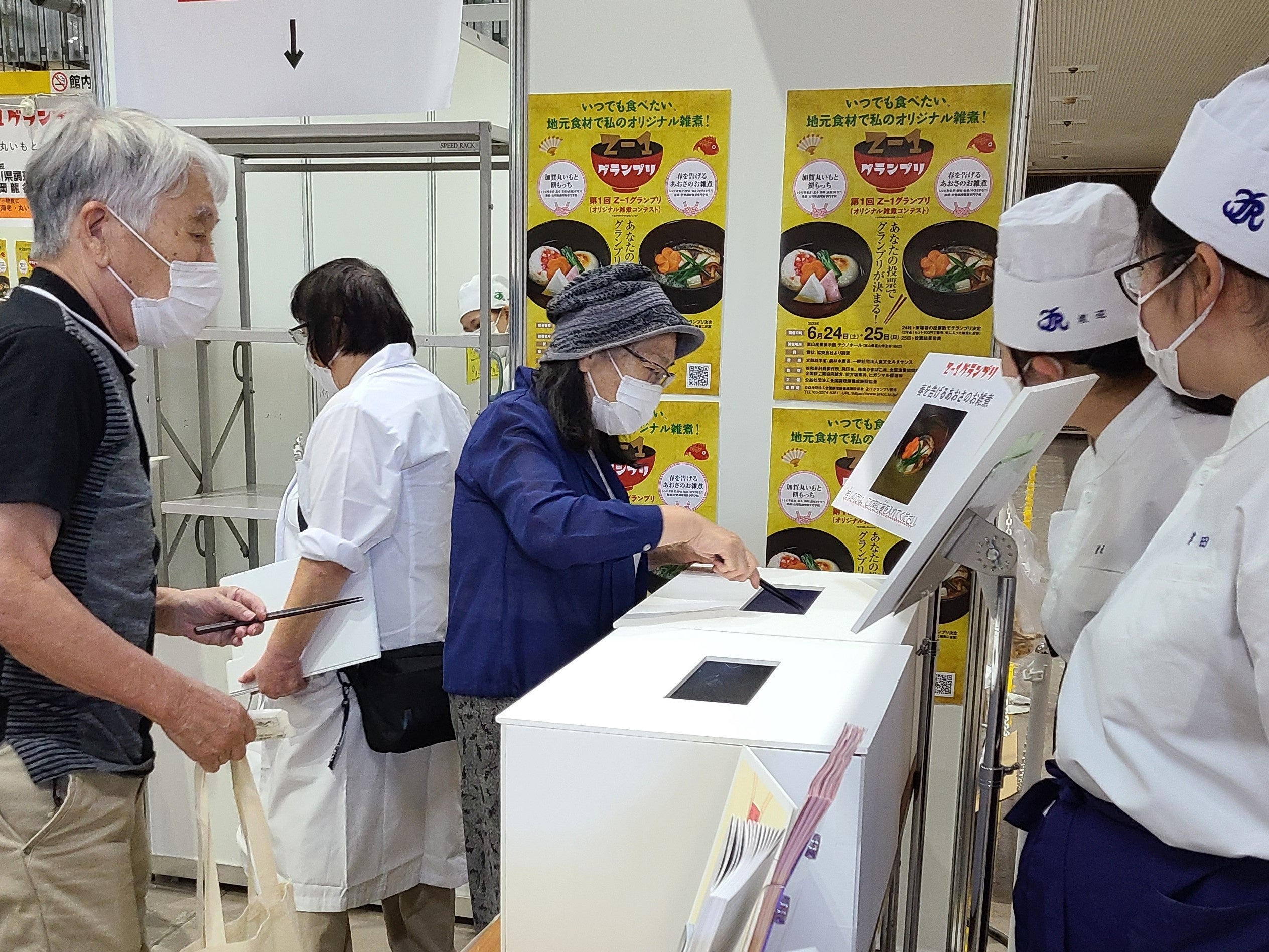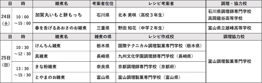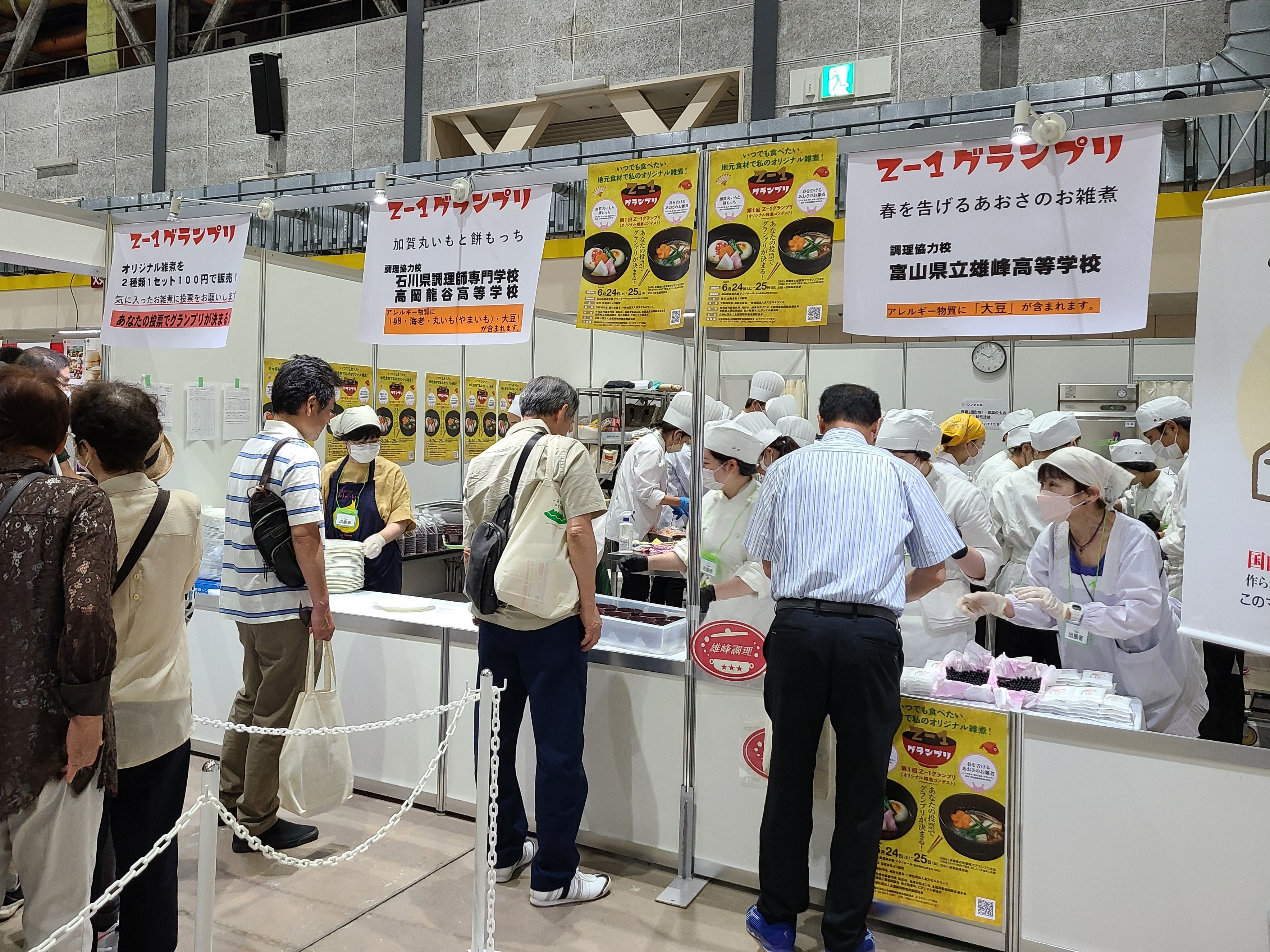 全国の小・中学、高校生から応募のあったオリジナル雑煮レシピ1,077作品から、最終審査に残った2作品を調理師学校が調理し、500セット限定で来場者に販売しました。購入者による食べ比べ・投票により、石川県の北本美咲さんの作品がグランプリに決定しました。