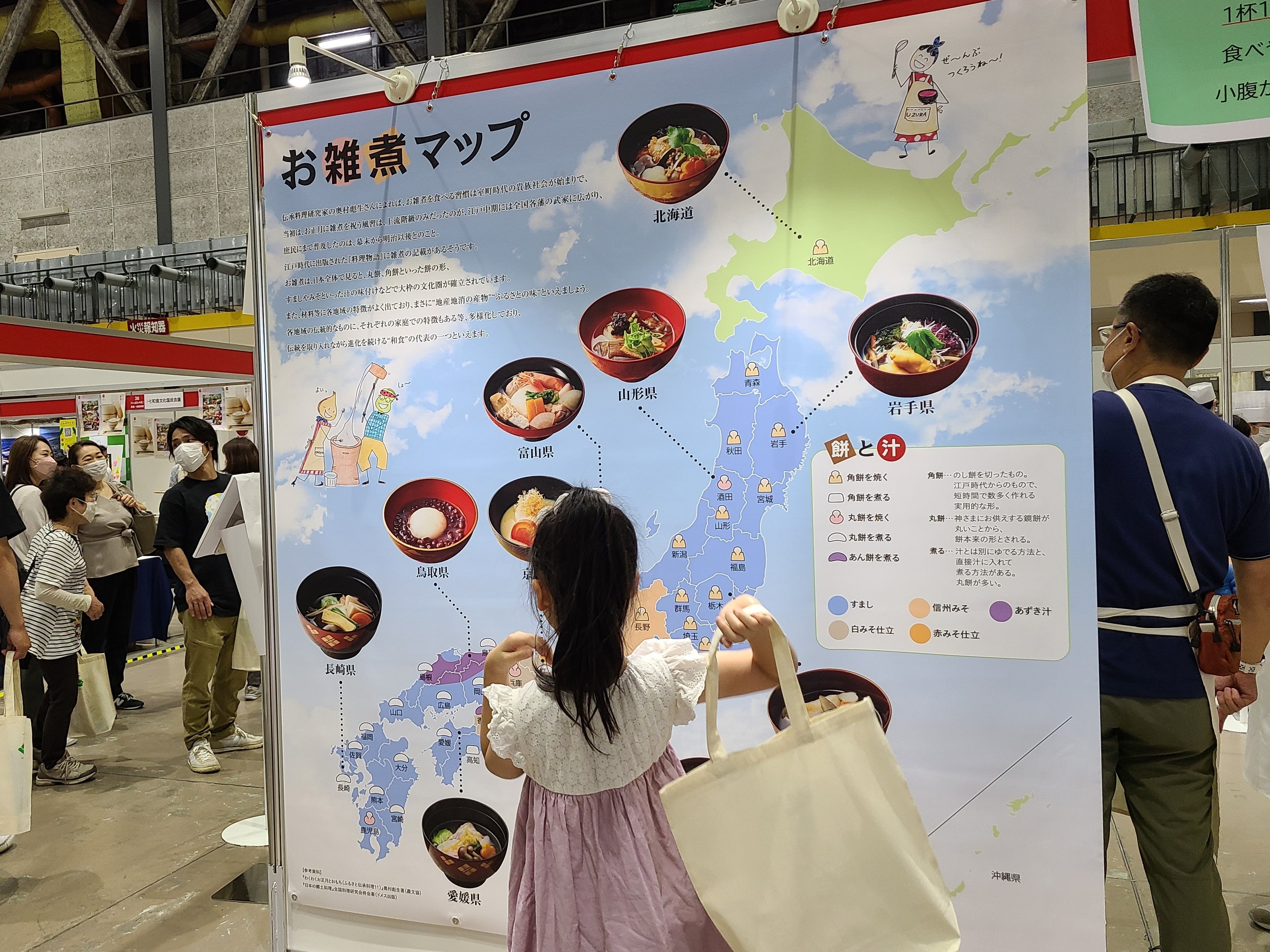 また、全国の雑煮のレシピを記載した「お雑煮紹介パネル」、地域ごとの雑煮の特徴・傾向を日本地図上に分布した「お雑煮マップ」を展示しました。