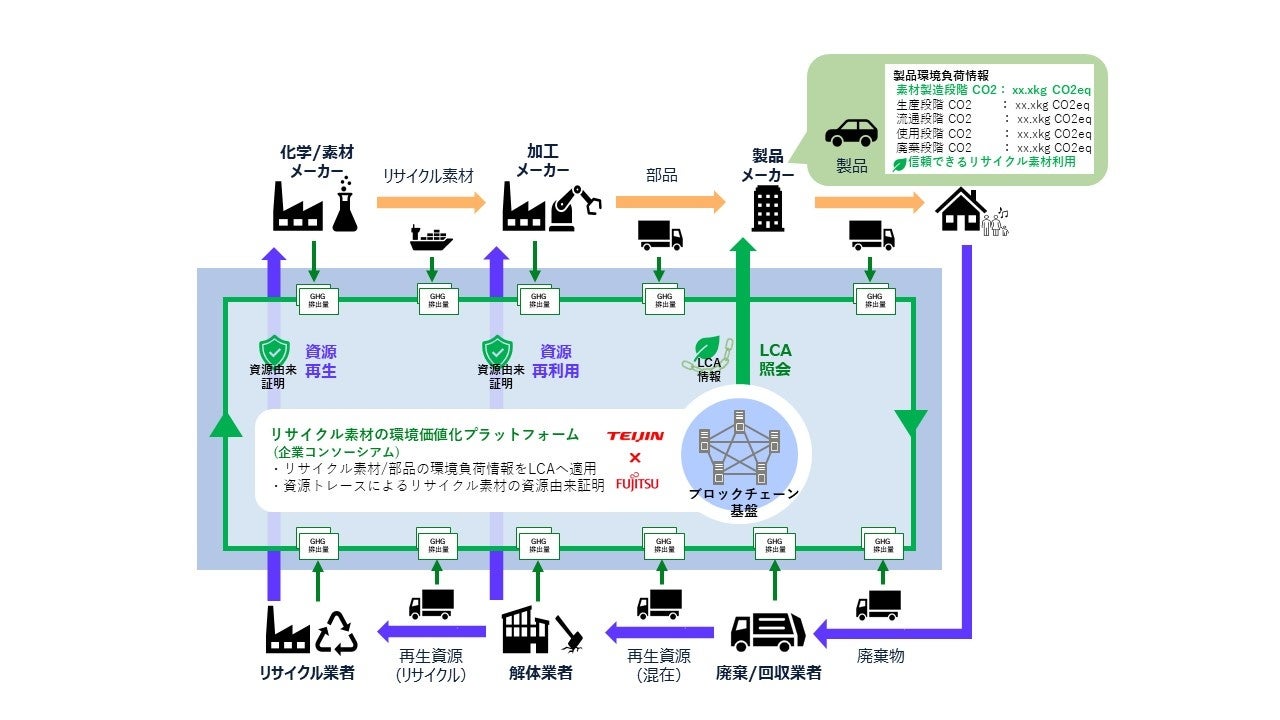 帝人は、炭素繊維、アラミド繊維などの製造工程における温室効果ガス(以下、GHG)排出量の算出方法を確立し、FRPの再生に関する取り組みも推進しています。富士通は、高い透明性とトレーサビリティを担保し、事実上情報の改ざんを不可能とするブロックチェーン技術を活用したシステム構築について多くの実績を有します。本共同プロジェクトは、両社がこれまで培ってきた技術やノウハウを融合し、業界に先駆けてリサイクル素材の利活用による環境価値化プラットフォームを立ち上げ、市場適用を図っていくものです。