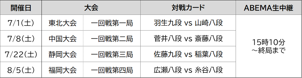 一回戦第一局生中継「ABEMA」URL https://abema.tv/channels/shogi/slots/CVX6ewWtF9PP9h