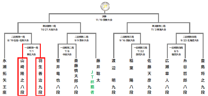 本年度の「将棋日本シリーズ JTプロ公式戦」(以下「JT杯」)開幕戦(一回戦第一局東北大会)は34年連続出場の羽生善治九段と2年連続7回目出場の山崎隆之八段の戦い。会場は宮城県仙台市の夢メッセみやぎ。公開対局として、事前抽選で当選した観戦者や同会場で開催される「テーブルマークこども大会」の参加者等の目の前で対局が繰り広げられる。またその模様は15時10分からABEMAでも生中継される。