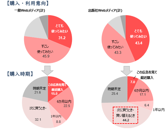 (cap)広告接触における「購入・利用意向」と「購入時期」。出版社Webメディアは「次に買うとき・買い替えるとき」が突出して高く4割強を占めた