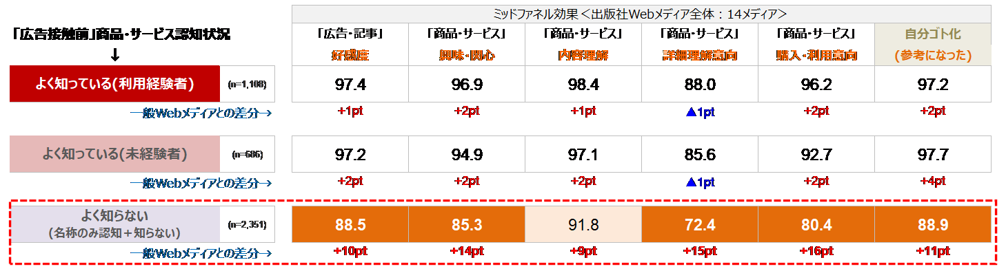 広告接触前の認知レベルごとに広告効果を見た場合、「よく知らない」層=「商品理解が浅い層」におけるミッドファネル効果が、出版社Webメディアはすべての項目で、一般Webメディアを大きく上回りました。