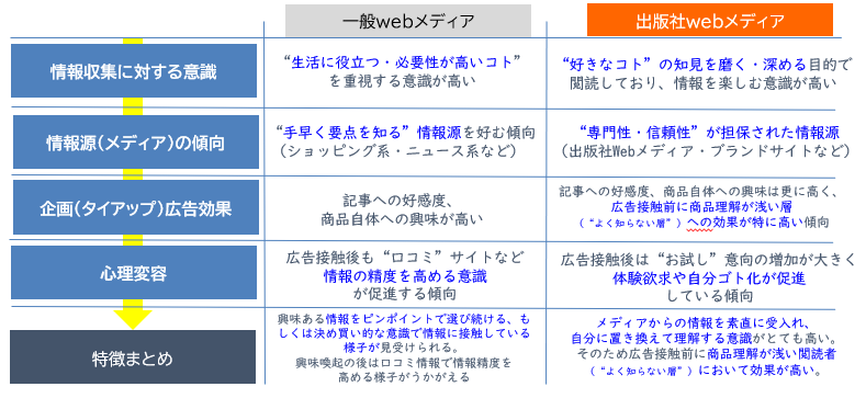 今回の調査では、一般Webメディアと出版社Webメディアでは、以下のような違いがあることがわかりました。