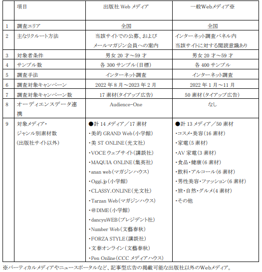 調査目的:デジタル領域における出版社Webメディアの有意性(媒体価値・読者熱量)を客観性高く解明し、今後の効果的かつ効率的なプランニングに資するデータベースを構築する。