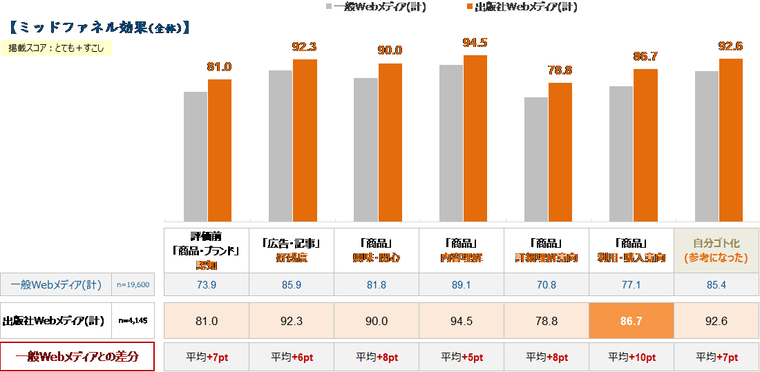 出版社Webメディアは「商品」の事前認知が高く、訴求効果の素地が一般Webメディアより高め、“広告・記事”への好感度も高く、ミッドファネル効果が全体的に高くなっていることがわかりました。