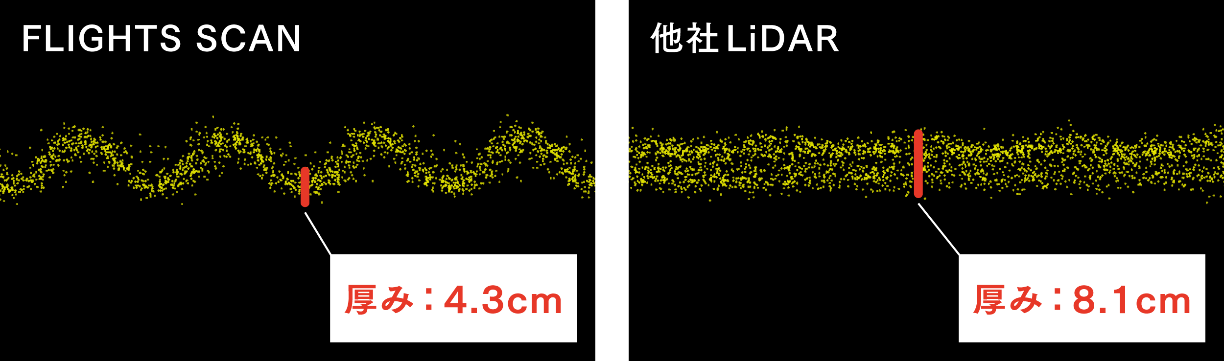 高性能なレーザーセンサーおよびシステムにより、計測対象の形状や構造を忠実に再現した点群作成が可能。更に、FLIGHTS SCAN®で取得した点群は従来のLiDARと比較しても厚みが薄く、まとまった綺麗な層として確認することができます。