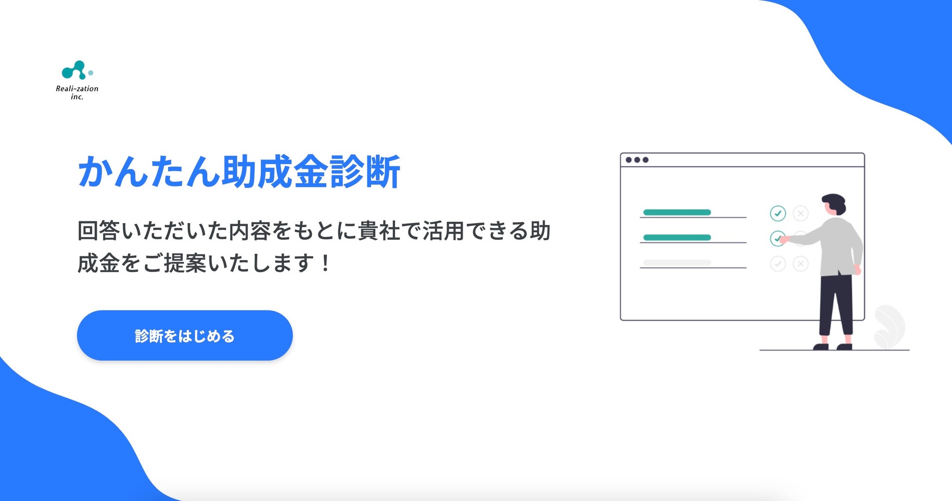 「世界一優しい行政手続きに」をキャッチコピーとする、株式会社リアリゼイション(本社:l東京都渋谷区)は、助成金診断システム「ラクリア助成金診断システム」のOEM提供を開始いたしました。