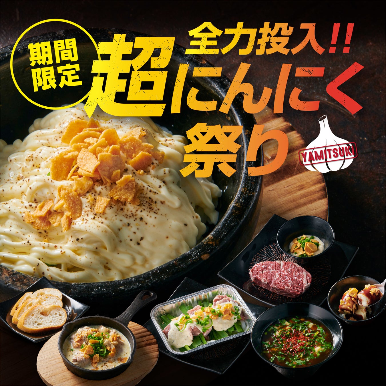 「超にんにく祭り」でご提供させていただくメニューは「鶏とガーリックのチーズクリーム煮」「塊ハラミ×ガリマヨ」「ジューシーハラミのガリマヨ焼き」「にらにんにくクッパ」「石焼ガリマヨ背徳飯」「ガーリックチョコアイス」の6種で、「ジャストミートコース」以上の食べ放題コースでお楽しみいただくことができ、もちろんすべての商品は単品でのご注文も可能です。暑い夏を乗り切るためのスタミナをつけるため、にんにく感たっぷりのラインナップに全力投入しました。