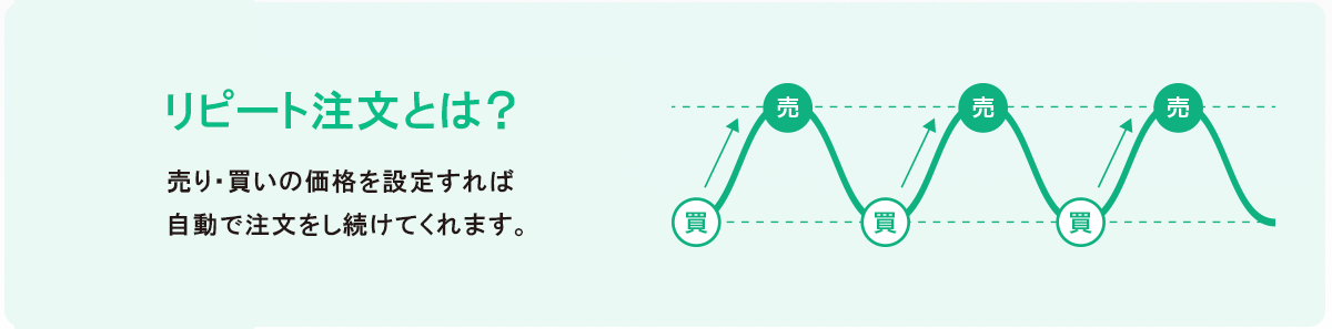 自動売買機能とは、一定のルールに基づいて24時間売買を繰り返す取引手法のことです。当社が提供開始する自動売買機能は、100円から取引できるため、自動売買機能を活用したことがない方でも手軽に始めやすいことが大きな特徴です。自動取引の手法としては、注文内容をあらかじめ設定し自動で取引を行うリピート系注文で、レートの上限・下限や売買の値幅など、シンプルな設定でお取引を開始することができます。一定値幅で価格が上下を繰り返すようなレンジ相場でも、自動的に繰り返し利益を積み上げていくことが期待できます。