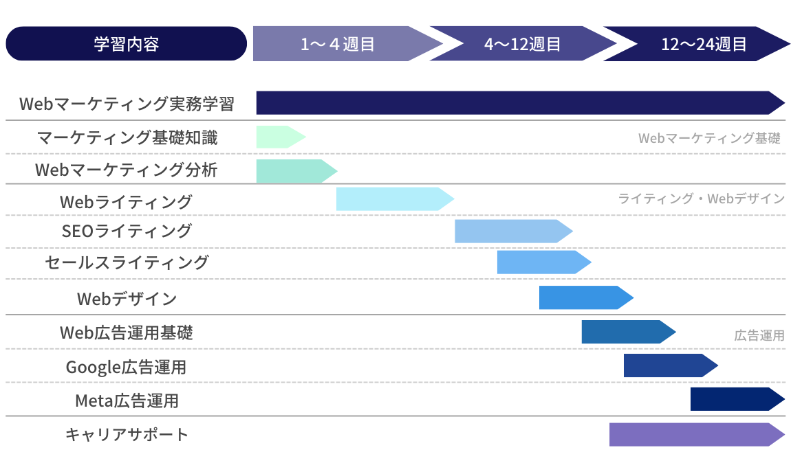 また、取り扱い商材が多いことから、興味がある分野の商材を通して「Webマーケティング」を学ぶことが可能となっています。