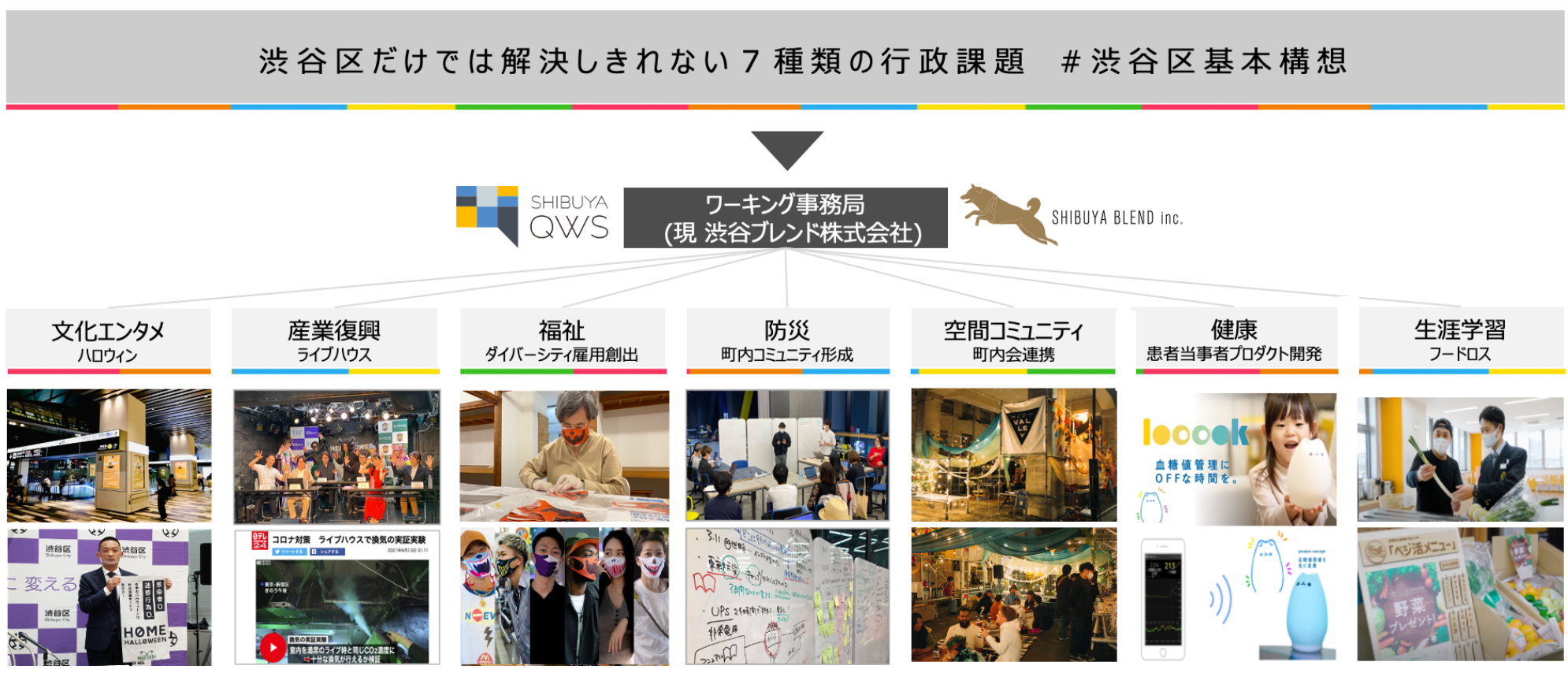 渋谷ブレンドは渋谷区の基本構想に則り、行政だけでは解決しきれない7種類の課題に対して自らプロジェクトを組成し民間を巻き込む形で解決に向かうワーキング事務局からスタートいたしました。