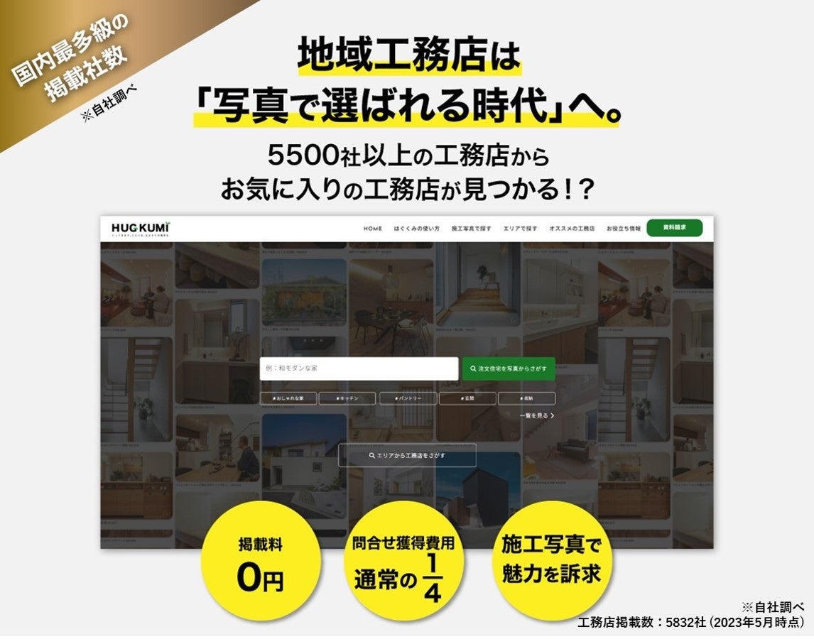 「HUGKUMI」は施工写真で魅力を訴求できることが特徴で、写真投稿によって注目度を上げられる設計になっています。さらに国内最多級の工務店掲載数(※)で、多くのこれから家を建てるユーザーのニーズを満たします。