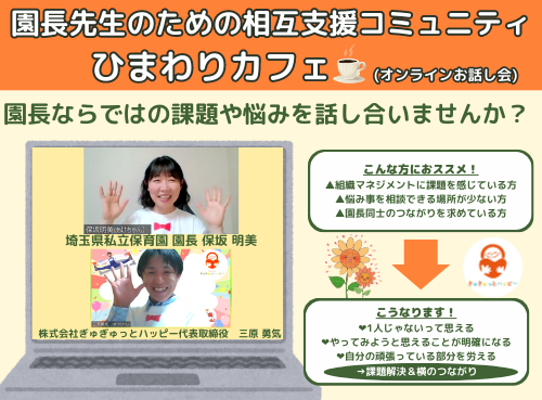 現役の保育園園長の保坂先生と共同して“園長先生のための相互支援コミュニティひまわりカフェ”を立ち上げました。