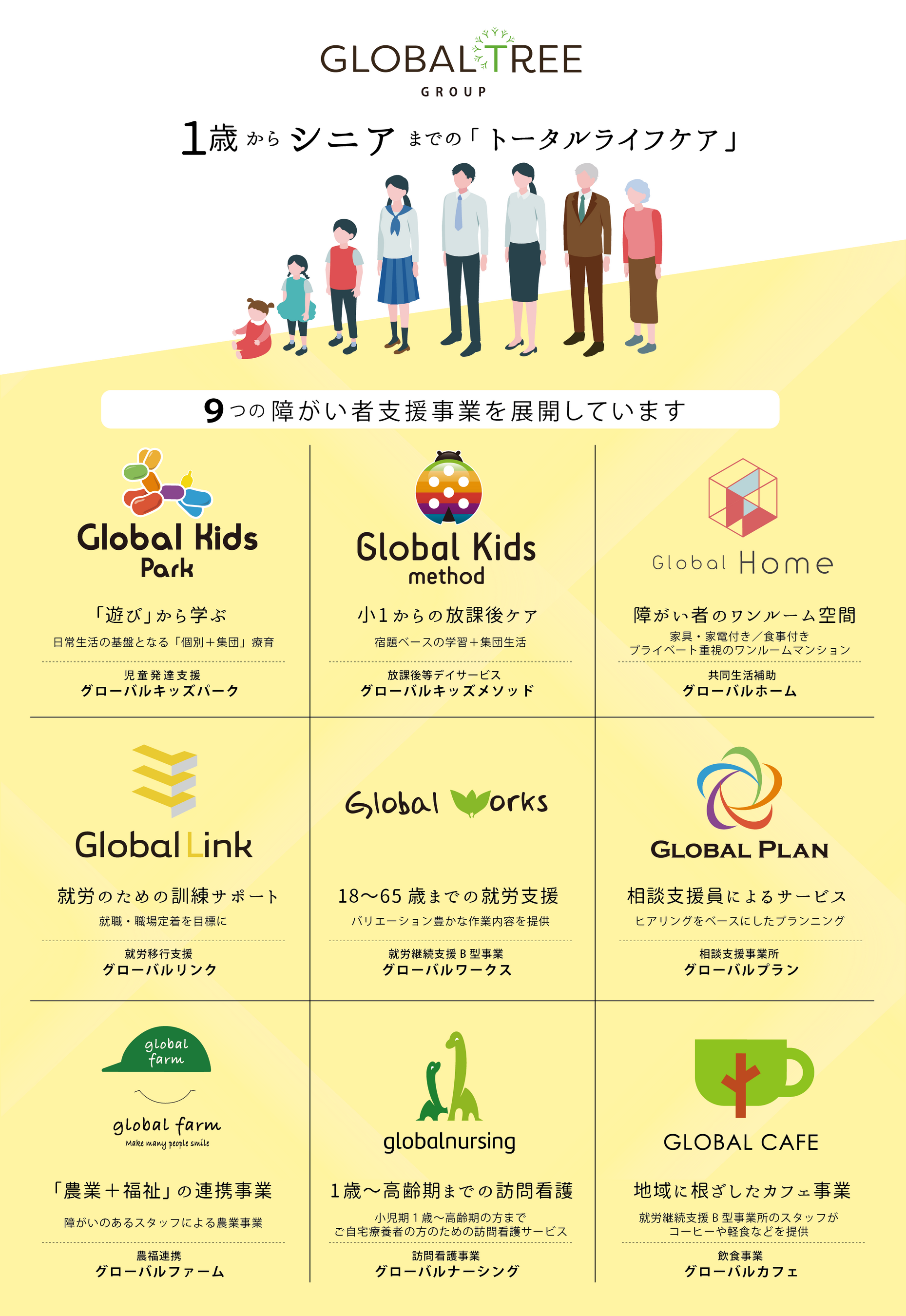わたしたちGLOBALTREEグループは、障がい児童への早期療育から、その先の将来を見据えた福祉サービスを目指して、現時点で9つの事業を展開しています。各それぞれの部門が有機的につながり合いながら作用し、「18歳以上の方の就労支援」「住まいを提供する障がい者グループホームの運営」、本年度においては「居宅においてのケアを提供する訪問看護事業」や、「障がいのある利用者様が運営するカフェ」の新規事業にも新たに着手していきます。