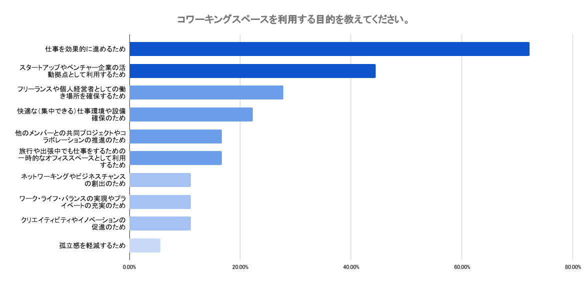 利用目的で最も多かった回答は「仕事を効率的に進めるため」が72.2%、続いて「スタートアップやベンチャー企業の活動拠点として利用するため」が44.4%という結果になりました。働く場所としての確保を目的に利用されている方が多いことが分かりました。