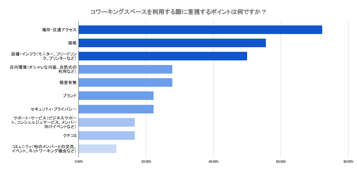 「コワーキングスペースを利用する際に重視するポイントは何ですか?」という問いに対して、最も多かった回答は「場所・交通アクセス」で72.2%、続いて「価格」が55.6%、「設備・インフラ(モニター、フリードリンク、プリンターなど)」が50.0%という結果になりました。