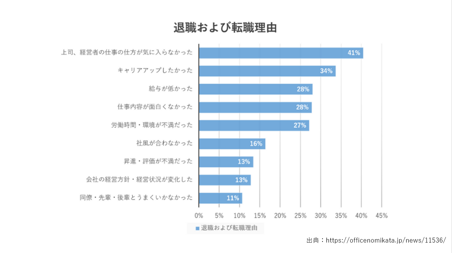 「上司、経営者の仕事の仕方が気に入らなかった」という理由が最も多く、全体の41%を占めています。つまり、2.4人に1人が、上司の働く姿勢を見て失望し、会社を離れてしまっているのです。