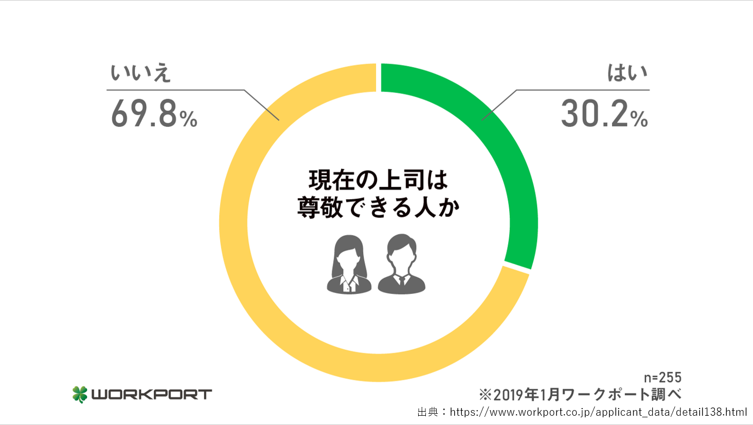 社員に現在の上司を尊敬できるかを聞いたアンケートによると、約70%の社員が「尊敬できない」と回答しています。